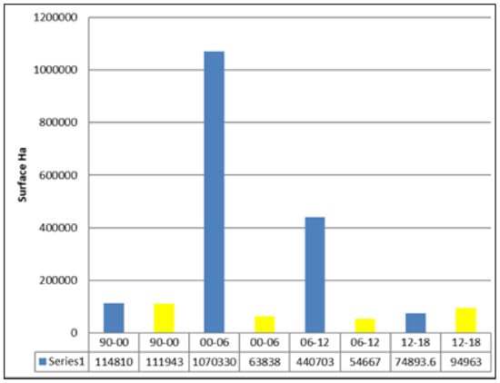 Some categories, that registered a significant raise of total surfaces in 2006, showed an opposite trend in 2012, such as CLC211, 231 and 324. If we analyze the total change surface per year and category, we see that the most dynamic classes are those related to deforestation and afforestation (CLC324, 312, 311 and 313, Figure 12).