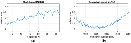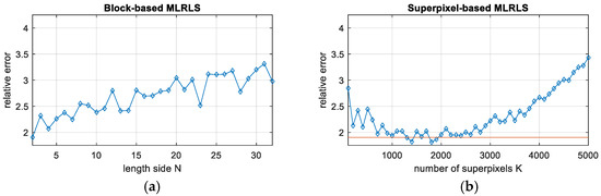 The number of superpixels K of the optimal relative error for the superpixel-based MLRLS.