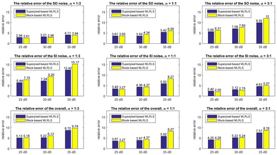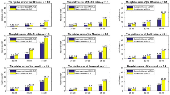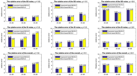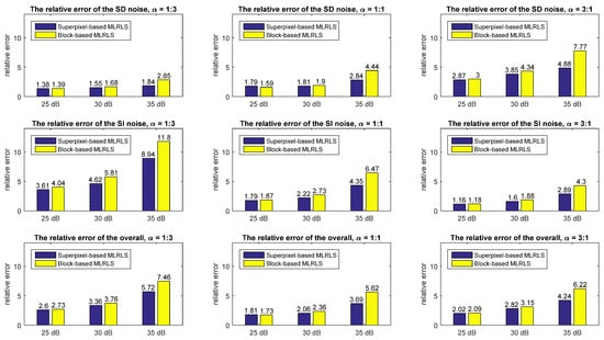 Spectral subsampling is also performed on the HSI Pavia Centre to obtain a lower spectral resolution. The dataset is subsampled by 1:2 in the spectrum. The superpixel-based MLRLS and the block-based MLRLS are performed on the subsampled dataset. The estimated relative error is shown in Table 7 and Figure 13. This indicates that after spectral subsampling, the estimation errors of the two algorithms decrease compared to higher spectral resolution images. The estimated relative error of the superpixel-based MLRLS decreases by 0.14%–23.84% (except for that of the SD noise when SNR = 25dB, ), with an average decrease of 4.13%. The estimated relative error of the block-based MLRLS decreases by 0.43%–33.27%, with an average decrease of 8.14%.