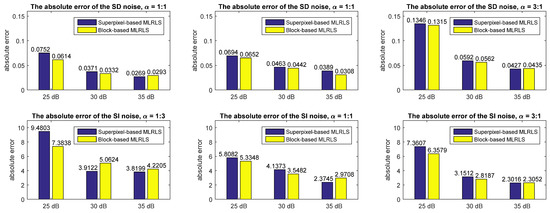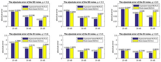 The estimated relative errors are shown in Table 8 and Figure 15, and the estimated absolute errors are shown in Table 9 and Figure 16. The experimental results show that the proposed algorithm performs not as good as on the regular HSI datasets. This is because superpixel segmentation cannot accurately detect the boundary or contour of a highly textured HSI as a regular image. Therefore, the HSI might not have enough homogeneous regions to guarantee a reliable estimation of noise variances. Thus, when estimating the noise level of a highly textured HSI dataset, the block-based MLRLS may be a proper substitute for the superpixel-based MLRLS.