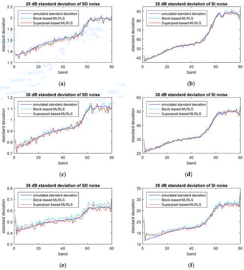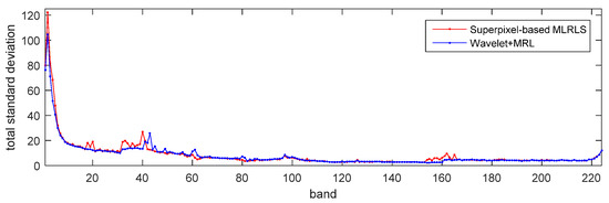 In this experiment, the proposed algorithm the superpixel-based MLRLS is applied to the second sub-dataset of Low Altitude. Since there is no ground truth to evaluate the results of noise estimation for a real-life dataset, the denoising method in the [30,31] is chosen for comparison, indirectly verifying the reliability of the proposed algorithm. This denoising method is based on wavelet transform and MLR, accordingly, denoted by the acronym Wavelet+MLR. In fact, a denoising method cannot separately estimate the variances of the SD noise and SI noise. However, it can estimate the noise power by the difference between the noisy dataset and the denoised dataset. On the one hand, by Equation (5), the total standard deviationcan be calculated by the noise power. On the other hand, by Equation (5), the total standard deviationcan be calculated by the standard deviations of the SD noise and the SI noise estimated by the superpixel-based MLRLS. If the total standard deviationsestimated by the two methods match, the effectiveness and reliability of the superpixel-based MLRLS can be verified.