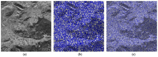 The snapshot of the textured AVIRIS (airborne visible/infrared imaging spectrometer) dataset Yellowstone 0 and its superpixel segmentation, (a) original image (61st band), (b) superpixel segmentation (K = 500), (c) superpixel segmentation (K = 2000).