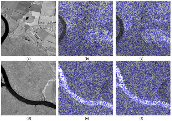 Sub-datasets of low altitude in the 60th band: (a) covered by complex ground objects; (b) superpixel segmentation (K = 500), (c) superpixel segmentation (K = 1000), (d) covered by simple ground objects, (e) superpixel segmentation (K = 500), (f) superpixel segmentation (K = 1000).