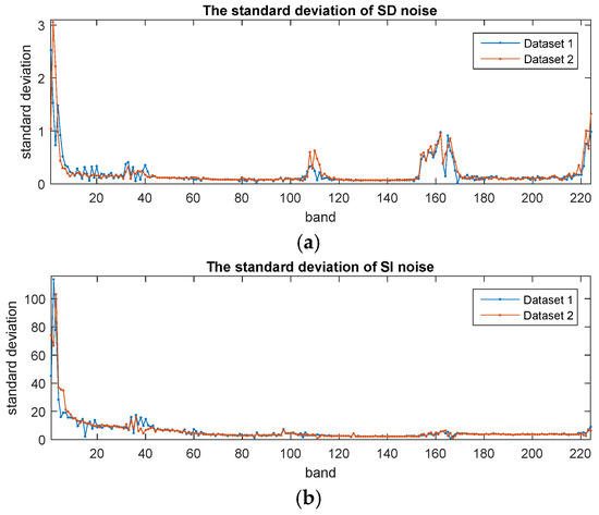 The standard deviations of (a) the SD noise and (b) the SI noise estimated on the two datasets covered by different ground objects from one scene.