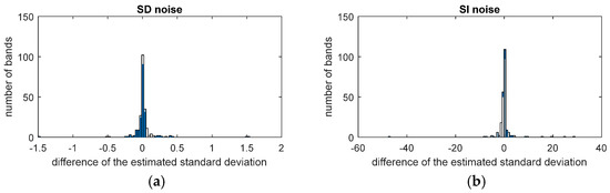On the other hand, Figure 18 demonstrates that although the ground object components of the two sub-datasets are quite different, their standard deviation curves are similar. In this paper, the Pearson correlation coefficient is used as the similarity metrics for the standard deviation vs. the band. The Pearson correlation coefficient measures how highly correlated two vectors are in a range of [−1, 1]. A correlation coefficient of 1 means that the two vectors are perfectly positively linearly related, while a correlation of 0 means that the two vectors do not have any linear relation. The coefficient of the estimated standard deviation vs. band of the SD noise is 0.9218, and that of the SI noise is 0.8449. Figure 19 gives a histogram of the differences between the estimated standard deviations of the two datasets. In most of the bands, the differences between the estimated standard deviations of the two datasets are very close to zero. Occasionally, a few values corresponding to unreliable estimation in the water vapor absorption bands deviate far from zero. Eliminating these bands, the coefficient of the estimated standard deviation vs. the band of the SD noise is 0.9828, and that of the SI noise is 0.9402.