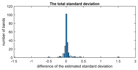 Figure 20 shows the curves of the total standard deviation vs. the band estimated by the two methods. Figure 21 shows a histogram of the differences of the total standard deviations estimated by the two methods. It is observed that in most of the bands, the differences of the total standard deviation between the two methods are very close to zero, except for a few water vapor absorption bands. The Pearson correlation coefficient of the estimated total standard deviation is 0.9885, which is very close to 1. This indicates that the estimated total standard deviation from the two different methods match perfectly. Therefore, the proposed algorithm is effective and reliable.