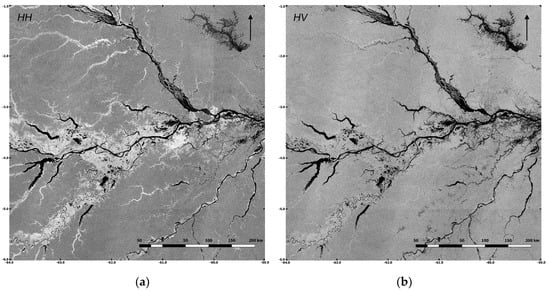 ALOS-2 PALSAR-2 ScanSAR 5° × 5° tile composite (PALSAR-2 cycle 27, July 2017) over the Central Amazon Basin. (a) HH-polarization. (b) HV-polarization (© JAXA).