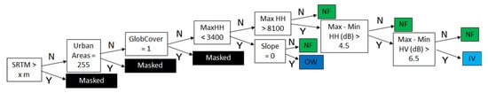 Decision tree applied to derive classification for maximum inundation. IV: inundated vegetation, SV: seasonally submerged vegetation, OW: open water, NF: non-flooded vegetation. The SRTM elevation threshold was adjusted for each sub-basin to account for variations in elevation and topography amongst the sub-basins. Ancillary data on urban areas and land cover were used to mask anthropogenic areas. The elevation and anthropogenic areas are all under the “masked” class.