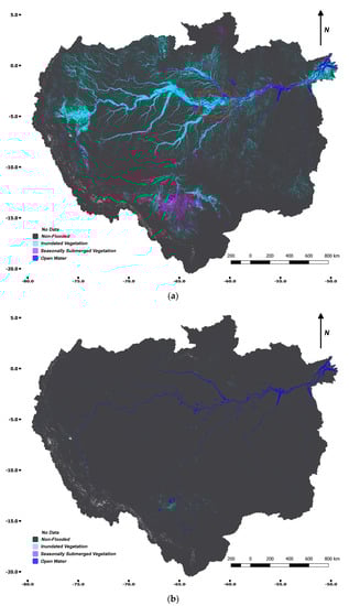 The classifications in Figure 6a,b above illustrate the vast extent of seasonal inundation in the Amazon Basin, annually flooding an area the size of Spain. The majority of the seasonally inundated varzea (white water) and igapò (black water) wetlands are located along the Amazon river main stem and its largest tributaries and in the sub-Andean wetlands in Peru. White water rivers include the Solimões, Madeira, Purus and Juruá rivers. They originate from the Andes and contain nutrient-rich sediments that result in the light-coloured water. Black water rivers have transparent water due to low volumes of suspended matter but are high in humic acids. Floodplains from black water rivers have a lower fertility than white water floodplains [2]. The largest areas of seasonally submerged vegetation (purple areas in the lower part of Figure 6a) occur in the Beni savannahs in the Bolivian part of the Madeira basin.