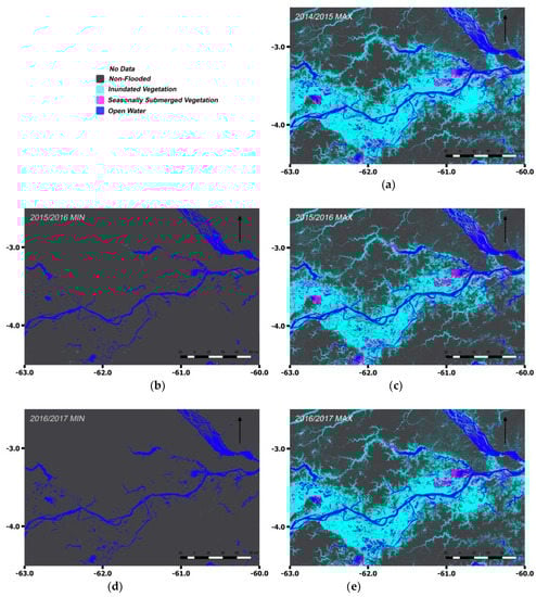 Minimum and maximum inundation extents over three hydrological years covering the region in the bounding box in Figure 6. Light blue: inundated vegetation, blue: open water; purple: seasonally submerged vegetation; grey: non-flooded; white: no data. (a) 2014/2015, (b,c) 2015/2016 and (d,e) 2016/2017.
