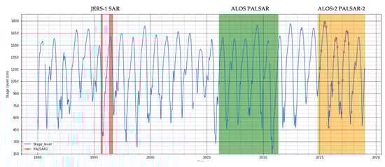 River stages 1990–2018. Station o-385, Itapeua, Rio Solimões (S4.058°/W63.028°). Red, green and yellow fields indicate JERS-1 SAR, ALOS-PALSAR and ALOS-2 PALSAR-2 acquisition periods, respectively. Red crosses indicate PALSAR-2 acquisition dates and illustrate how well the annual maximum and minimum inundation levels around the gauge station were captured in the PALSAR-2 data.