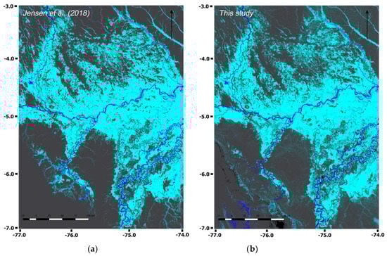 Classification images of Pacaya-Samiria. Light blue: inundated vegetation; blue: open water; grey: non-flooded/masked areas/no data. (a) Classification by Jensen et al. [16]. (b) Classification in this study.