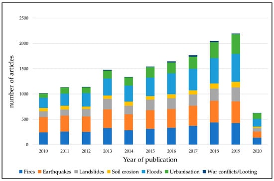 In light of the above and for the purposes of this communication, a literature review was conducted based on scientific articles found in the Scopus engine over the last decade (2010–2020), following similar studies in the past [13,14]. Scopus was selected among other scientific repositories since it is the largest relevant abstract and citation database of peer-reviewed literature, scientific journals, books, and conference proceedings. Various hazards, such as fires, earthquakes, landslides, soil erosion, floods, urbanization, war, conflicts, or looting, were queried in the specific engine. In addition to the hazard type, the term satellite was included, while the query was limited to articles published between the period 2010–2020.
