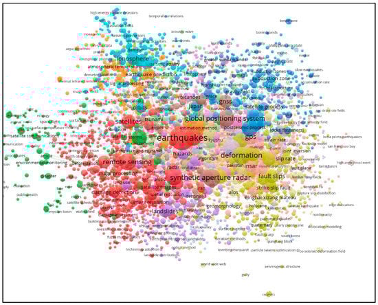 These findings showcase the continuous increase of the exploitation of space-based instruments for hazard analysis, even with significant variations regarding the number of applications per type of hazard. It is also still difficult to distinguish within the existing literature those applications that exploited the benefits of satellite observations specifically for the topic of cultural heritage (apart from looting). For instance, the query results from the Scopus engine relate to earthquake hazard provided more than 3500 articles, as mentioned earlier. Based on the keyword data for all these articles, a co-occurrence method analysis was implemented in the VOSviewer software tool [15]. The results of this analysis are shown in Figure 2. Each color represents a different thematic cluster of the keyword data for all articles found in the search engine. The size of each circle represents the magnitude of each thematic cluster (i.e., how many times the specific term was used in the 3500 articles). The links between the clusters are also visualized. In total, more than 10,000 different keywords were used in the 3500 publications, indicating either the method or the data used in their studies.
