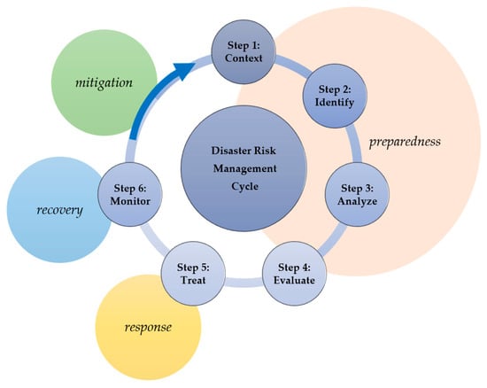 Disaster risk management (DRM) cycle steps (from [5,17,18]), represented by blue circles, while other accepted components of the DRM cycle used beyond cultural heritage applications are shown in the outer circle.