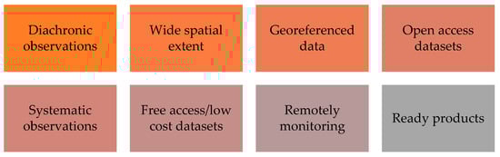 Two important properties of satellite observation data and products that make their use unique for management plans is that they are geo-referenced, having almost global coverage. In addition, satellite remote sensing can provide systematic and diachronic observation with a high revisit period, thus creating a unique multi-temporal dataset, which is ideal for cultural heritage applications. Additionally, the free access and use policy that characterizes data and products need to be taken into consideration, especially when dealing with large areas. The use of space-based data is also ideal when considering other factors, such as budget constraints and limitations of in situ inspections that prohibit proper ground observations (i.e., war-conflicted areas). Towards this direction, the European Copernicus program implements a full, free, and open access (FFO) data policy, which allows user free access, use, and re-use of data and information, while eliminating any barriers in order to ensure extensive re-use of these datasets. While this is true for the medium-resolution Sentinel-1 and Sentinel-2 datasets (providing radar and optical images, respectively), access to higher resolution images from the Copernicus Contributing Missions [46] is not free (with exceptions for research grants). The beneficial properties of satellite observation products for cultural heritage are summarized in Figure 5.