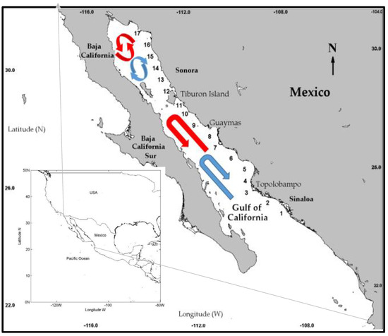 The Gulf of California (GC) is a semi-closed sea situated in the northwest of Mexico; its dimensions are roughly 150–200 km wide and 1100–1400 km long including the entrance zone to the GC with depths varying from about 200 m at the head to 3600 m at the mouth. The general circulation and its seasonal variability result from the forcing of the Pacific Ocean (PO) at its opening (water mass intrusions and tidal motion of low frequency) [5]. The GC is characterised by being a very dynamic sea with tidal currents, seasonal winds, upwelling systems, and high solar radiation; these characteristics determine the strong physical dynamics attributed to mesoscale processes (such as thermocline and surface circulation induced by the wind, gyres, and filaments [6,7]), which develop high productivity levels, nutrient concentrations, and dispersion [8,9].
