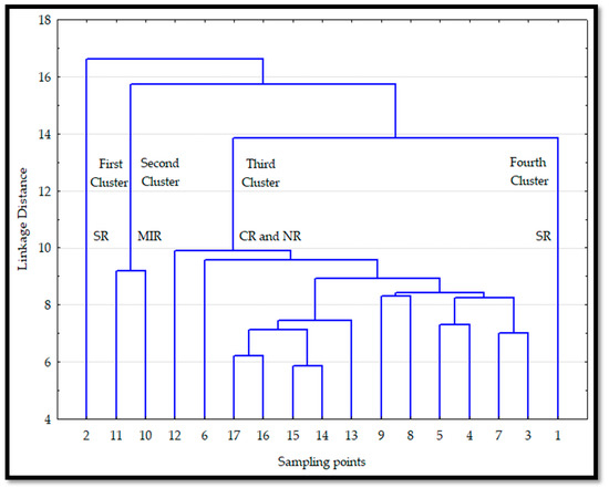 The conglomerate analysis gathered the Chl a values in four clusters when the linkage distance units were greater than ten (Figure 3). When this figure is analysed from left to right, the first and fourth groups include the sampling points two and one, corresponding to the south region (SR). The tenth and eleventh sampling points constitute the second cluster midriff islands region (MIR) while the third cluster includes the remaining sampling points, mostly from the central and north regions (CR and NR), respectively. The resulting clusters were not geographically close due to diverse factors that shall be explained in the discussion section. Therefore, from now on, the SST cluster that classified the four regions obtained by Robles-Tamayo et al. [36] shall be used for the Chl a analyses.