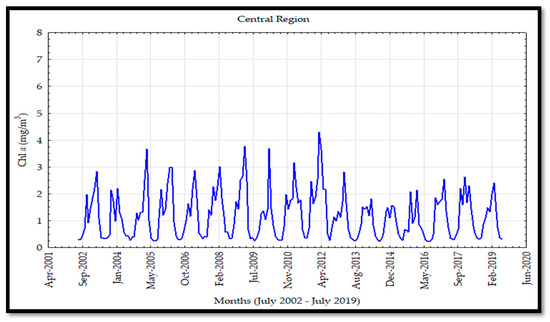 The time series analyses for the Chl a monthly data for each region showed values ranging from 0.2 to 8 mg/m3. Chl a values in the SR (Figure 4) ranged from 0.2 to 6 mg/m3 while it ranged from 0.2 to 5 mg/m3 in the CR, and the variability was small (Figure 5). The MIR (Figure 6) showed the widest values of Chl a (0.4–8 mg/m3) whereas the NR (Figure 7) showed the narrowest ones (0.2–4 mg/m3). The SR and MIR showed high levels in the Chl a concentration from 2002 to 2012 with values up to 6 and 7 mg/m3, respectively; after that year, the Chl a levels recorded an important decrease with values close to 4 mg/m3 from 2013 to 2016. This effect was not significant in the CR, particularly in the NR where the Chl a levels did not show much variability.