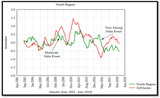 In all the study regions, the main frequency was the annual variability and those associated with the semi-annual, seasonal, and interannual periods. A clear relationship of the SOI index was observed in the first years of this study, contrary to the period from 2010 to 2019 where we observed a clear effect of the 2009–2010 El Niño index (moderate) and 2015–2016 index (strong) in the Chl a annual concentration variability throughout the study area. These effects on Chl caused a delay in the Chl a increase and a lag of Chl a with the SOI index.