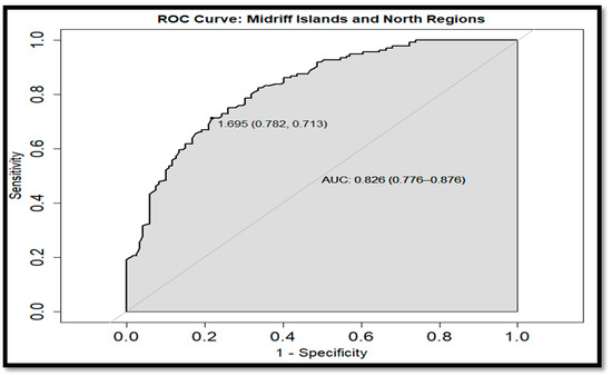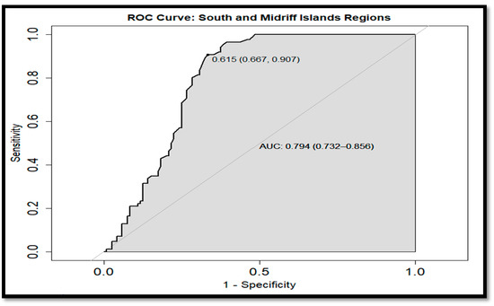 The receiver operating characteristic (ROC)-curve of the south region (SR) and the midriff region (MIR) on the mainland coast of the Gulf of California (GC) warm period (WP).