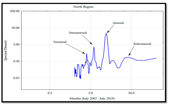 Spectral analysis of the chlorophyll a (Chl a) concentration for the north region (NR) on the mainland coast of the Gulf of California (GC).