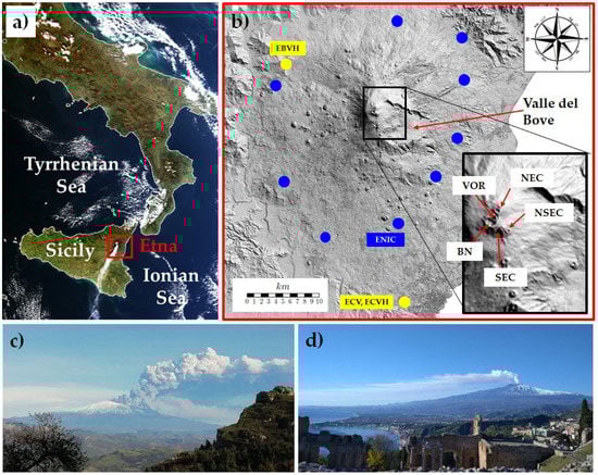 Etna (Sicily, Italy, see Figure 1a) is one of the most active volcanoes in the world. Since 2011, it has showed an intense sequence of explosive activities that spanned from strombolian to short-lasting but astonishing episodes of lava fountains that fed plumes [,,]. This eruptive regime gradually switched since 2016 to long-lasting mild explosive strombolian activities coupled with isolated episodes of lava flows from the summit crater of the volcano []. The Christmas 2018 Etna eruption was preceded by a period of moderate explosive activity and small lava flows at the summit craters [,]. On the morning of 24 December, this eruptive style suddenly increased, and a 2 km long eruptive fracture opened on the southeaster flank of the volcano [], spilling out a lava flow toward the Valle del Bove (see Figure 1b). The eruption produced a vigorous ash column, which spread up to about 8 km above the sea level (asl), dispersing south-eastwards of the volcano and causing a disruption to Catania international airport. The explosive activity that was mainly produced by several vents along the fracture [] decreased since the late afternoon of 24 December and ended the day after. Lava flow gradually ended on 27 December. Figure 1c,d show the 24 December paroxysm and the 27 December activity seen from the Enna and Taormina towns, respectively.