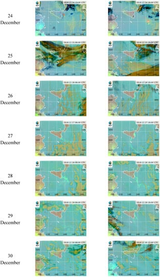 Figure 2 shows the SEVIRI ash/SO2 volcanic clouds detection for several images from 24 to 30 December 2018 by applying the described RGB composite. The presence of volcanic ash and SO2 are identified by the red and green colors, respectively.