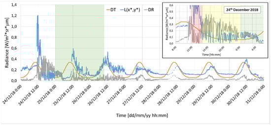 In Figure 3 the orange, blue, and gray lines represent the Dynamic Threshold (DT(t)), the radiance measured at 3.9 μm for the central pixel (L(x*,y*)) and the Difference of Radiance (DR(t)) time series, respectively [], obtained from the SEVIRI measurements collected every 5 min from 00:00 on 24 December to 23:55 on 30 December. The green area indicates the time interval of the meteorological cloud system present on the area of measurements.