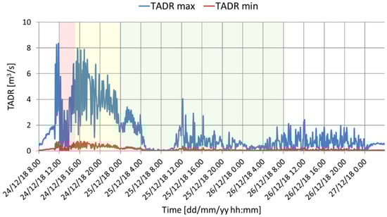 Time Averaged Discharge Rate (TADR) time series derived from SEVIRI data from 24 to 27 December 2018. Blue and maroon lines indicate the maximum and minimum TADR values respectively. The red, yellow, and green areas emphasize the influence of volcanic plume, the lava flow, and the presence of meteorological cloud.