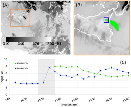 (A) Brightness temperature at 10.8 μm considering the SEVIRI image collected on 24 December 2018 at 12:00. (B) Image of Sicily with the blue square area and the green area used for the Volcanic Plume Top Height (VPTH) and Volcanic Cloud Top Height (VCTH) computation, respectively. (C) Plot of VPTH (blue points-line) and VCTH (green points-line) time series obtained from SEVIRI data collected every 15 min on 24 December 2018. The green and blue vertical bars represent the VCTH and VPTH SEVIRI retrieval uncertainties, respectively.
