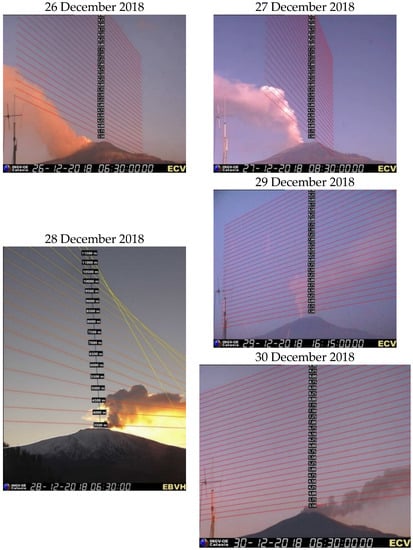From 25 to 30 December, the volcanic cloud was too transparent even close to the summit craters, making the dark pixel procedure inapplicable. As a result of that, and being the volcanic cloud height required for the ash and SO2 quantitative retrievals based on the VPR procedure, this parameter was evaluated by exploiting the independent measurements of the ground-based calibrated VIS cameras network in Catania (ECV) and Bronte (EBVH) on the west side of Etna at 760 m asl (see yellow circles in Figure 1) [,,]. Figure 6 shows one camera frame for each day from 26 to 30 December 2018. Note that all the images derive from the ECV camera placed at Catania (CUAD) except for that on 28 December, for which the Bronte (EBVH) VIS camera installed on the western side of Etna was used. During this day, the plume flowed exactly toward the south, making the height retrieval from the ECV camera unfeasible.