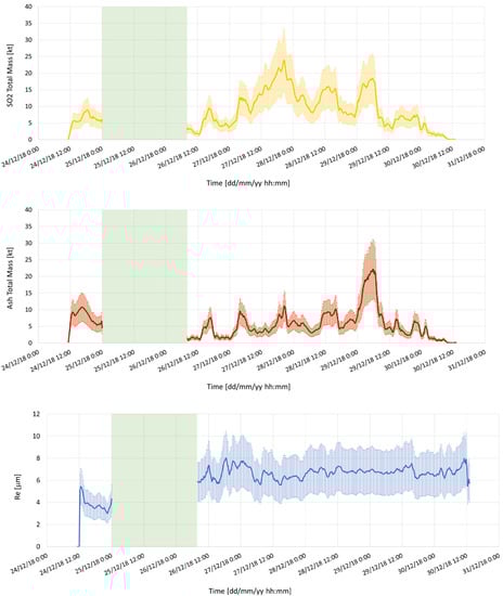 The ash mass, AOD, Re, and SO2 mass were obtained by processing the SEVIRI mages every 15 min with the VPR procedure. Figure 7 shows the time series of SO2 total mass (Ms, upper plot), ash total mass (Ma, middle plot), and ash Re (lower plot). The error bars are set to 40% of the values retrieved []. As in Figure 3 and Figure 4, the green area indicates the interval of time in which a wide meteorological cloud system was over the Mediterranean area, preventing any reliable retrievals. The graph shows that the SO2 mass is generally higher than the ash mass, except on 24 December and partially on 29 December. SO2 retrievals show different peaks greater than 15 kt from 27 to 29 December, while the maximum ash value is obtained 29 December with about 20 kt. The mean Re is about 4 μm on 24 December and about 7 μm for the rest of the period. This is justified by the presence of the climax of the eruptive activity only on 24 December. Note that the VPR procedure corrects for the effect of the volcanic ash on the channels used for the SO2 retrievals. Uncertainty on the ash optical properties (derived from the ash refractive index) could lead to significant uncertainty also on SO2 retrievals.