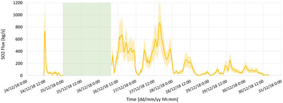 where l is the transect width (in this case 3000 m), v is the wind speed (m/s), and Mi is the SO2 columnar abundance (kg/s) for a certain pixel. By means of the wind speed, the flux at 30 km is then reported to 15 km, which is immediately comparable with the FLAME measurements (see Section 4.3). Figure 8 shows the SO2 flux over the eruptive period. The SO2 emission rates were highly variable with peaks that exceed 600 kg/s on 24, 27, and 28 December and a mean value over the whole period of 185 kg/s.
