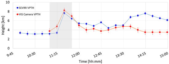 Section 3.3 introduced the ground-based VIS cameras used for the VPTH validation. Figure 9 shows the VPTH comparison between the filtered data obtained with the ECV camera installed at CUAD in Catania and SEVIRI data collected on 24 December. As the figure shows, the two curves are in close agreement until 13:30 to temporally decouple, starting from 13:45 with the SEVIRI retrievals rising higher than the camera estimations. Before 13:45, our SEVIRI estimations are also consistent with those obtained from Calvari et al. [], which uses the ECV VIS camera and the approach developed by Scollo et al. []. An agreement is also found between the maximum height of the volcanic cloud (VCTH) obtained from the VIIRS image collected on 24 December at 12:46 (8.8 +/− 0.2 km) [] and the VCTH obtained from SEVIRI approximately at the same time (7.9 +/− 0.3 km at 12:45). Differently, the high VPTH’s values (more than 13 km at about 11:30) estimated in [] by the uncalibrated wide-angle VIS camera (ECVH), located at CUAD in Catania next to the ECV (see Figure 1), are not supported by both our ground-based and satellite retrievals.