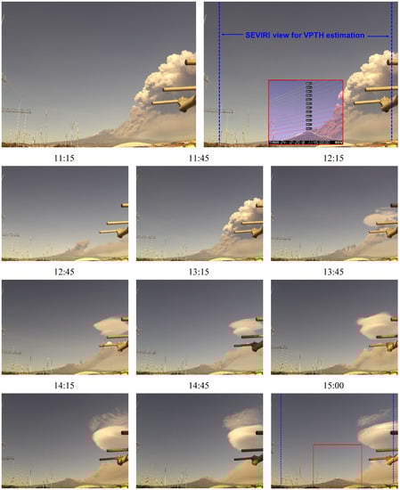 In order to deepen the discrepancy between the SEVIRI and ECV retrievals after 13:30, the images of the ECVH camera were considered. In Figure 10, the image on the upper left shows the ECVH frame collected on 24 December at 11:30, while in the upper right, the same image is displayed together with the image collected by the ECV camera at the same time (red box) and the SEVIRI view (blue dashed lines, 9 × 9 pixels centred on Etna craters). Below, the time frames of Etna eruption observed by the ECVH camera between 11:15 and 15:00 every 15 min are shown. From about 12:00, the images show the gradual formation of a wide orographic lenticular cloud over the volcanic one, with features similar to the “Contessa” cloud that often covers the top of Etna, but bigger and located far from the craters. This cloud partially affected the SEVIRI view from the 13:45 onwards. As a result of that, from this time, the SEVIRI VPTH is not the height of the volcanic column but instead the height of this orographic cloud.