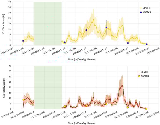 SO2 (upper plot) and ash (lower plot) total mass retrievals obtained from SEVIRI and MODIS. The vertical bars represent the SEVIRI retrieval uncertainties.