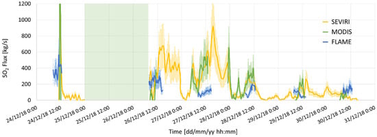SO2 flux obtained from SEVIRI (yellow), MODIS (green), and FLAME (blue). The yellow vertical bars represent the SEVIRI retrieval uncertainties.