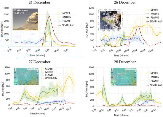 The 24 December plot (upper left plate of Figure 13) shows that only the FLAME network retrieved an SO2 flux before the beginning of the paroxysm that occurred at 11:15. The detection failure of SEVIRI and MODIS is due to the ground-based plume, which yields a too-small thermal contrast between the top of the volcanic plume and the underlying ground surface, thus making the satellite SO2 retrieval impossible. Moreover, the discrepancy observed during the paroxysm is also caused by high ash load in the plume, as highlighted by the ash flux curve of Figure 13 (see the dashed maroon line) and by the ECVH image collected at 11:45 (upper left plate in the plot). The ash presence has an impact on both the SO2 retrieval from satellite (the greater the uncertainty in the ash optical properties, the greater the errors of the ash correction for the SO2 retrievals []) and FLAME (by obscuring the signal).