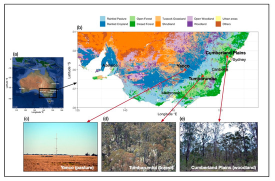 Spatial extent of the Southeastern Australia (SE Australia) study area. The panel (a) shows the spatial extent of the SE Australia study area over the Australian continent (image source: Google Earth). The red triangles on panel (b) indicate the locations of the three local sites. Background of panel (b) is the map of Australian Dynamic Land Cover Map (v2.1), provided by Geosciences Australia. Panels c–e are the photographs showing ground-view of each local site (image credit: TERN, https://www.ozflux.com).