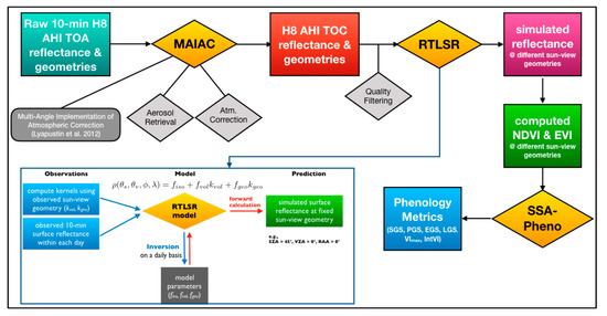Workflow diagram of Japanese Himawari-8 (H-8) Advanced Himawari Imager (AHI) data preprocessing, bidirectional reflectance distribution function (BRDF) modelling, and phenological metrics retrieval.
