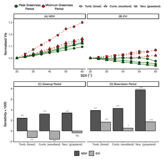 Sensitivity of VIs to SZA variations. (A,B) Changes in NDVI and EVI with variations in SZA from 20° to 60° (by every 5°) during the peak greenness period and the minimum greenness period respectively, at three local sites; (C,D) Comparison of the sensitivity of NDVI and EVI to changes in SZA during different phenological stages. For comparison among sites, VI values have been normalised by VISZA20 for each site. Sensitivity is defined as change in VI per degree change in SZA. Error bars on the plot indicate 95% confidence interval of the mean and the statistical significance of the slope is indicated as follows: "***" (p < 0.0001), "*" (p < 0.01), "ns" (non-significant, p > 0.05).\.