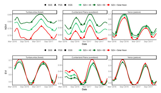Figure 5 shows the time series of NDVI and EVI normalised to different SZAs. Smaller SZA resulted in lower NDVI, with the magnitude of NDVIS-LSN was close to that of NDVIS-20 due to the selection of the lowest SZA within each day to generate the NDVIS-LSN (Figure 5). In comparison, sun-angle had a much smaller effect on the profiles of EVI (Figure 5). Greater SZA resulted in higher EVI over the minimum greenness period (the period when EVI declines from highest to the lowest within a growing season), but this effect was reversed in the peak greenness period (the period when EVI increases form the lowest to the highest within a growing season) (Figure 5).