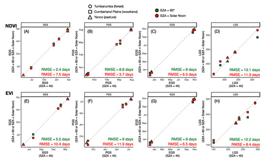 Figure 8 presents the cross-site relationships between phenological transitional dates retrieved from VIS-40 time series (x-axis, used as a reference) and those retrieved from VIS-60 or VIS-LSN time series (y-axis). Overall, seasonal sun-angle variations introduced non-negligible uncertainties on phenological transitional dates retrieved from NDVI and EVI. For NDVI, the uncertainties (RMSE) of using time series of NDVIS-LSN for retrieving SGS, PGS, EGS, and LGS, as compared to the use of NDVIS-40, were 7.5, 3.7, 6.5, and 11.3 days respectively (Figure 8A–D). The equivalent uncertainties for EVI were 10.4, 11.9, 6.5, and 8.4 days (Figure 8E–H). Difference in phenology retrievals between two constant SZA cases can be also observed (Figure 8).