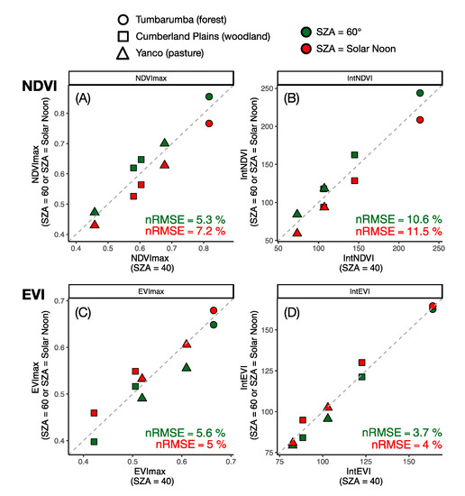 Cross-site relationship of annual peak VI (VImax) and annual integrated VI (IntVI) computed from NDVI and EVI with different SZA configurations at three local sites. (A,B) NDVImax and IntNDVI; (C,D) EVImax and IntEVI.