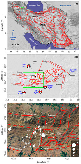 E-Azerbaijan, in northwestern Iran, is characterized by a complex active tectonics, linked to the main geodynamic regime controlled by the oblique convergence between the Arabian and Eurasian plates, with a present-day deformation rate of about 13–15 mm/year [7,10,11,14,16] (Figure 1a). In particular, this region represents a segment of the Alpine-Himalayan orogenic belt, whose origin is ascribable to several intense geodynamic processes (i.e., multiple accretion and continental collision consequent to the subduction and closure of the Tethys Ocean), which occurred between the late Eocene and the Oligocene epochs [7,18]. The local expression of this large-scale tectonic framework is represented by intense deformations and seismic activity, mainly located along strike-slip faults and thrusts, and analyzed through GPS measurements and earthquakes focal mechanisms (GCMT) catalog [12,16,23,24], respectively. Indeed, the recorded historical [25] and instrumental seismicity [19] in Iran suggests an intracontinental deformation concentrated in several mountain belts surrounding relatively aseismic blocks (i.e., central Iran, Lut and South Caspian blocks [14]).