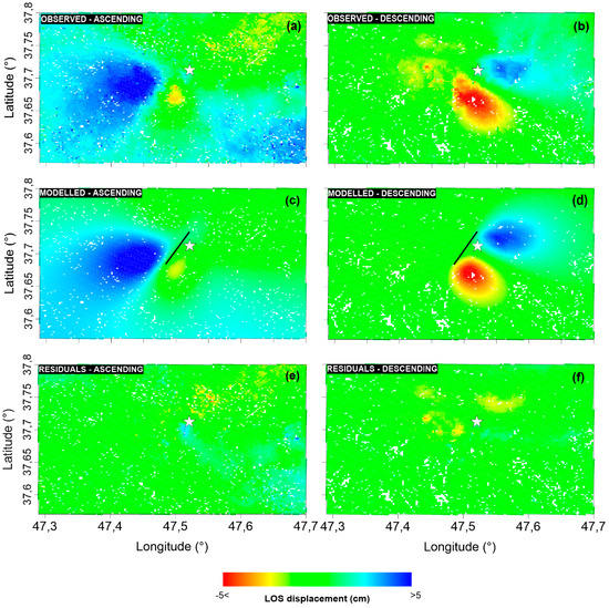 The results of the non-linear inversion are reported in Figure 3, where we show the LOS-projected original (Figure 3a,b) and modelled (Figure 3c,d) DInSAR measurements, as well as their residuals (Figure 3e,f), obtained as the difference between the original and the modelled data [30]. The retrieved results reveal that the modelled seismic source allowed to effectively replicate the DInSAR measurements and the best-fit solution consists of a left-lateral strike-slip fault. In particular, the retrieved fault plane is located approximately at 3000 (± 633) m depth b.s.l. (i.e., the depth of the center of the fault plane) and presents a strike of 29.17° (± 5), a dip of 79.29° (± 7), a rake of −4.94° (± 7), and a uniform slip of about 0.73 m (± 0.23), distributed over a source of about 6220 (± 1540) m × 5630 (± 2530) m (see Table 2 and Figure S2).