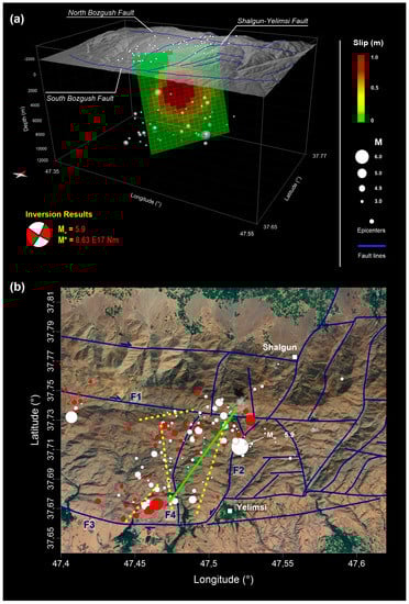 Linear inversion results. (a) Distributed slip (each patch extends for about 0.4 × 0.4 km2) and seismicity distribution (white circles and dots), displayed in 3D view. The computed focal mechanism is also reported. (b) Seismicity distribution recorded from 7 to 9 November 2019 (white circles) and from 10 November to 24 December 2019 (red circles) is shown as a function of magnitude (the higher the magnitude, the bigger the circles). The retrieved fault and the distribution of the fractures [21] generated by the seismic event are reported with the green line and the yellow dashed lines, respectively. The main local structures (derived from [8]) are also indicated with blue lines (F1, F2 = Shalgun-Yelimsi Fault, F3 = South Bozgush Fault and F4) and are superimposed on the 1 arcsec SRTM DEM of the zone.