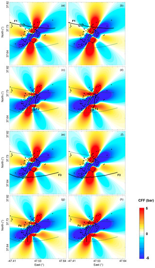 Starting from the geological structures reported in Faridi et al. [8] and according to the Coulomb 3.3 software convention [40,41], we set the receiver fault mechanism to strike = 95°, dip = 80° and rake 180° for the Fault 1 (F1); 190°, 80°, 0° for the Fault 2 (F2), known as the Shalgun–Yelimsi Fault; 275°, 80°, 180° for the Fault 3 (F3), known as the South Bozgush Fault; and 190°, 80°, 0° for the Fault 4 (F4). For each selected receiver fault mechanism, we tested two effective friction coefficients (i.e., 0.4 and 0.6) (Figure 5). We verified that this latter coefficient (i.e., μ′ = 0.6) only slightly modifies the Coulomb stress change map. Given the mechanism of the source fault (strike = 29°, dip = 80°, rake = −4.9°), the receiver faults having the larger portion falling in a positive CFF area are F1 and F3 (Figure 5a,b,e,f and Figure S3). However, this does not preclude the activation of the other two faults F2 and F4 (Figure 5c,d,g,h and Figure S3). Overall, our results indicate that the main event may have encouraged (i.e., positively stressed), with a positive loading, the activation of all the considered receiver faults. This is confirmed also by the distribution of the aftershocks (black dots in Figure 5) that occurred in proximity or exactly on the considered faults.