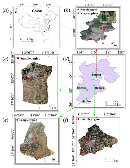 Location of study area: (a) China; (b) Beijing ang Xiaotangshan; (c) Jinzhou; (d) Hebei and Beijing; (e) Quzhou; (f) Renqiu.
